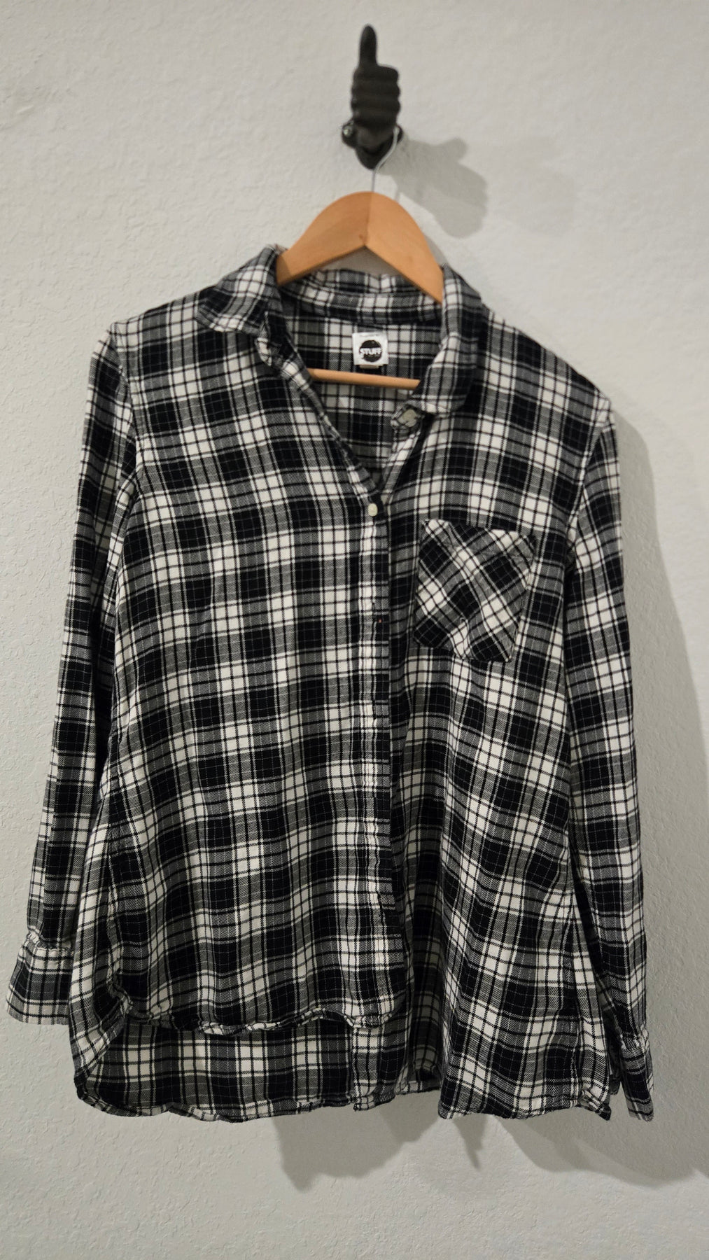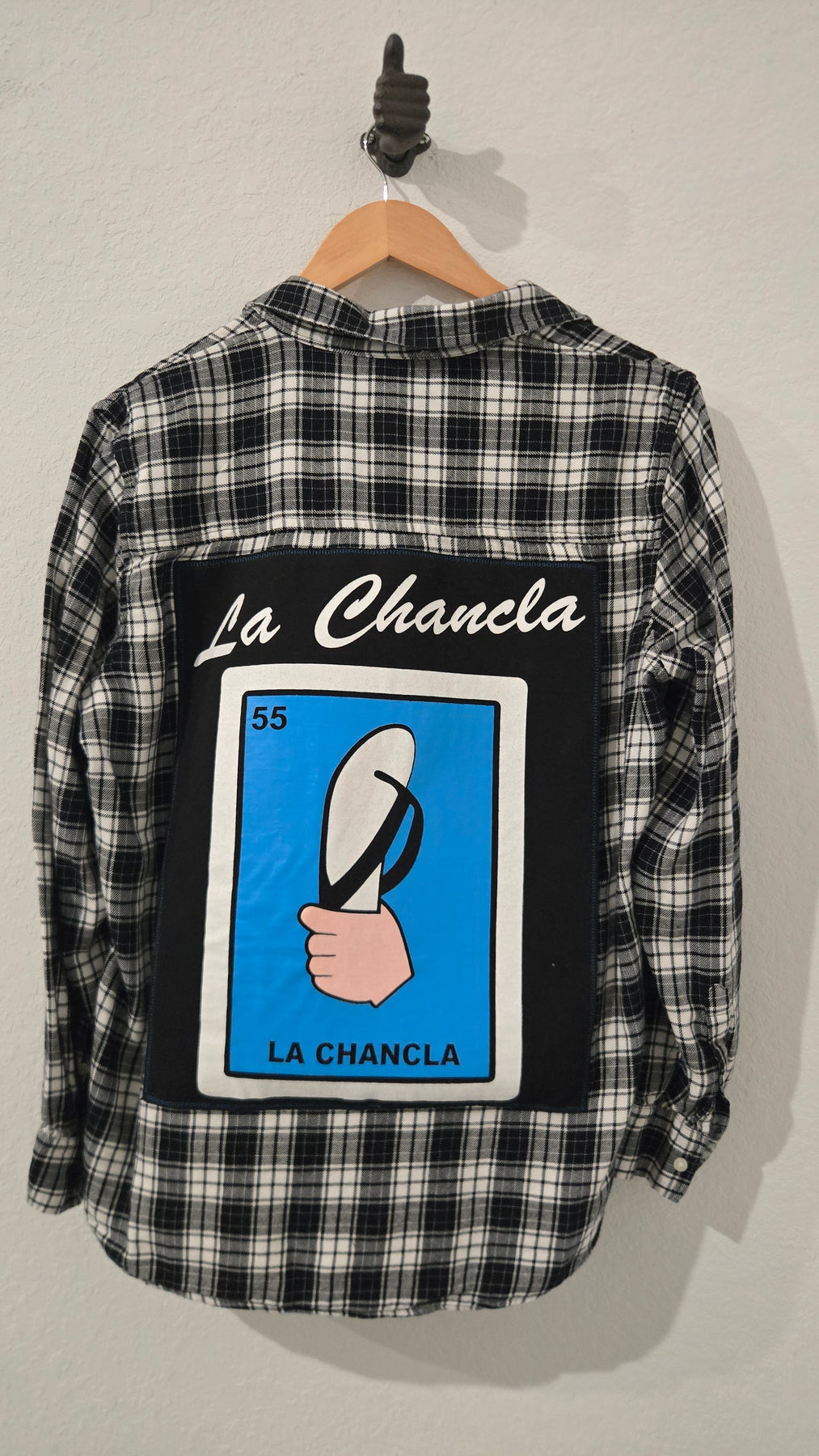 Upcycled hand-sewn Flannel featuring the iconic "La Chancla" card from the fun game, Mexican Bingo.