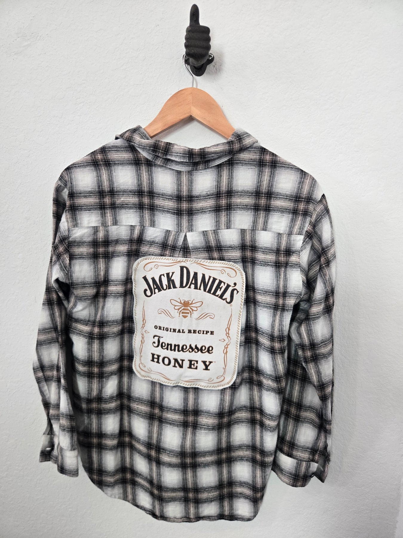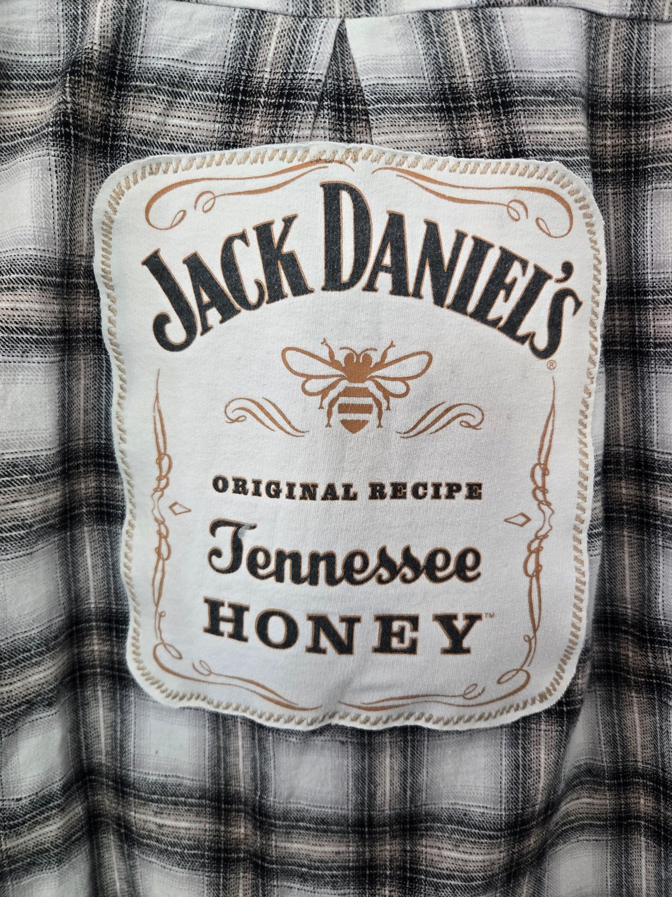 Upcycled, hand-sewn Flannel featuring the legendary whiskey, Jack Daniels.